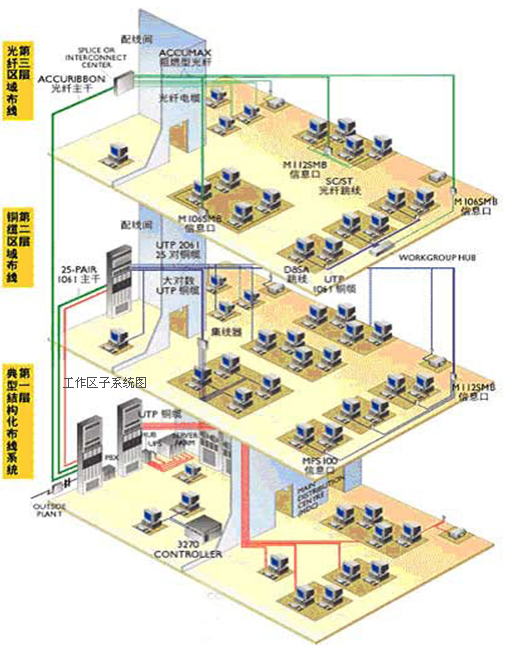 1. 工作区子系统 2. 水平子系统 目的是实现信息插座和管理子系统(跳线架)间的连接,将用户工作区引至管理子系统,并为用户提供一个符合国际标准,满足语音及高速数据传输要求的信息点出口。该子系统由一个工作区的信息插座开始,经水平布置到管理区的内侧配线架的线缆所组成。系统中常用的传输介质是4对UTP(非屏蔽双绞线),它能支持大多数现代通信设备。如果需要某些宽带应用时,可以采用光缆。信息出口采用插孔为ISDN8芯(RJ45)的标准插口,每个信息插座都可灵活地运用,并根据实际应用要求可随意更改用途。 3. 管理子系统 4. 垂直干线子系统 5. 设备室子系统 6. 建筑群子系统